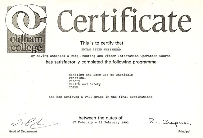 Bryan has his City and Guilds Certificate and also has further recognised certificates in timber treatments, having invested in the past on more training in this field.